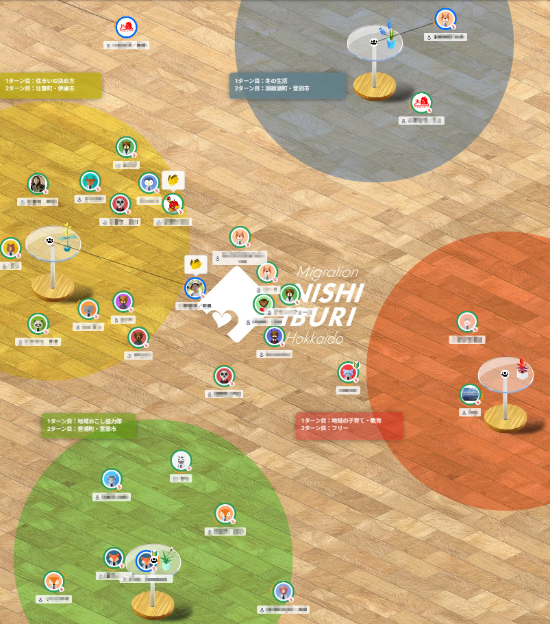 ただ、4つのテーマを同時に進行する中で、どこでどの話題が行われているのかを参加者がひと目で把握できることの重要性を強く感じるようになりました。そこで、回を重ねる中で実用性を重視したシンプルな構成へと見直し、現在は ovice の空間を4色に分けることで、参加者が迷わず、自分の関心のある話題に移動できるよう工夫しています。